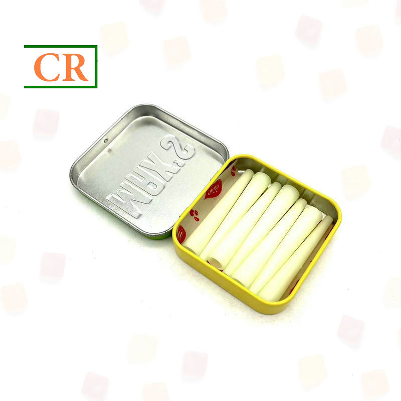This square tin case is designed for mints packaging that is developed many years ago and is still hot to pack mints in the market. Usually, the inside space could increase a butter paper to increase the attractive for mints. If packing pre-rolls, it's necessary to add printing butter paper, so it could increase the impression and keep pre-rolls dry.